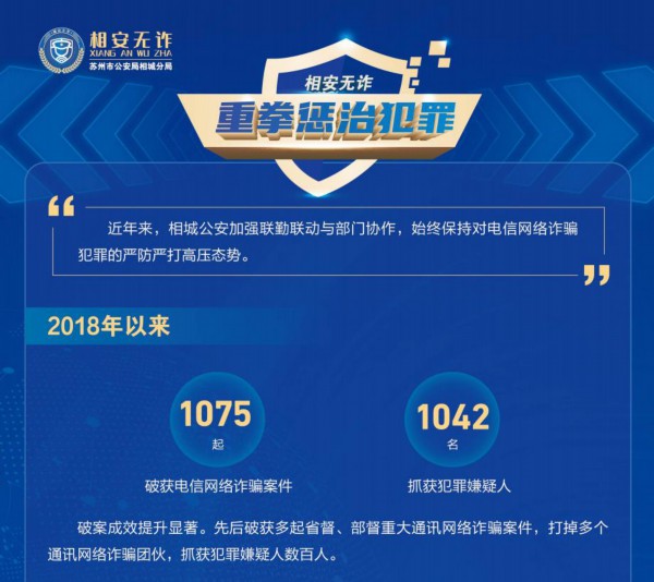 相城公安始终对电信网络诈骗犯罪保持严打高压态势。自2018年以来,先后破获千起通讯网络诈骗案件。其中,省督、部督重大通讯网络诈骗案件多起,打掉多个特大通讯网络诈骗团伙,有力打击震慑了诈骗分子的嚣张气焰。