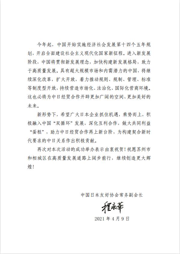 中日友好协会常务副会长(原驻日本国特命全权大使)程永华为工作会商机制成功建立发来贺信。
