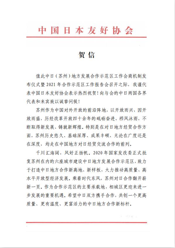 今年是中国“十四五”开局之年,江苏省将积极推进构建“双循环”新发展格局,坚定不移地更高水平推进改革开放,在服务全国构建新发展格局上争做示范。衷心希望通过双方的紧密合作,加强双方在智能制造、医疗康养产业等方面的交流,希望合作示范区积极贯彻落实中日地方发展合作重点工作,打造成为中日地方产业创新、协同发展的引领示范区。