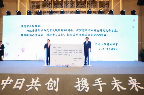 苏州市委副书记、市长李亚平,日本国驻上海总领事馆总领事(大使)矶俣秋男共同完成池田市天文望远镜捐赠发布仪式。