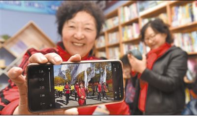江苏省扬州市邗江区新盛社区图书馆内,一位大妈展示自己的视频作品。