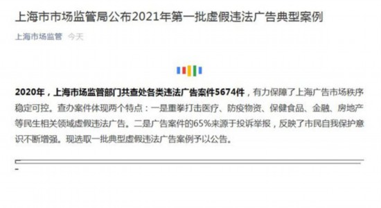 据上海市场监管局官方微信消息,上海市场监管局近日公布了2021年第一批虚假违法广告典型案例。据了解,2020年上海市场监管部门共查处各类违法广告案件5674件,案件主要体现两个特点:一是重拳打击医疗、防疫物资、保健食品、金融、房地产等民生相关领域虚假违法广告。二是广告案件的65%来源于投诉举报。