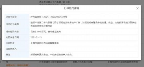 中国网财经梳理发现,2021年1月13号,上海浦申置业因违规发布房地产广告,对规划或者建设中的交通、商业、文化教育设施以及其他市政条件作误导宣传,被上海崇明市场监管局罚款3.1449万元。