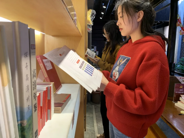 开放式的书架、整洁的桌椅、清新的绿植,让前来阅读休息的游客感到惬意和温暖,除了科普知识、种植养殖等种类多样的书籍,书院书架上还整齐地摆放着党史教育、红军故事、革命名人等书籍,引起了游客和周围群众浓厚的学习兴趣。