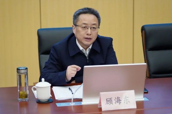 在上海自贸区临港新片区管委会,顾海东一行与临港新片区管委会党工委委员、专职副主任武伟等进行交流座谈。