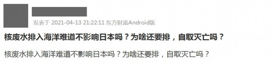 对于日本决定以海洋排放方式处置核废水,众多投资者也是非常关心。股吧中,有投资者发问:“核废水排入海洋难道不影响日本吗?为啥还要排,自取灭亡吗?”