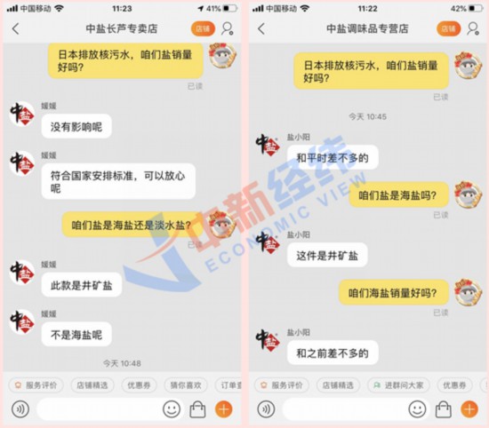 中新经纬记者联系几家售盐电商旗舰店工作人员,询问是否受到日本欲排核废水影响。客服回复称:“没有影响,可以放心,符合国家标准。”当询问近期销量时,客服表示:“和平时差不多。”