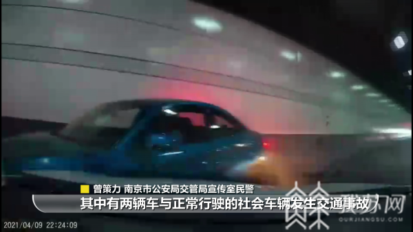 当晚10点23分,南京交警一大队接到群众报警,西安门隧道内有车辆追逐竞驶发生交通事故。一台社会车辆的行车记录仪拍下了车祸现场:事故发生前,一辆白车从右侧车道实线变道至视频车前方,以极快速度呼啸而去。几秒钟后,正常行驶的视频车被后车追尾,旋转一圈才停下。