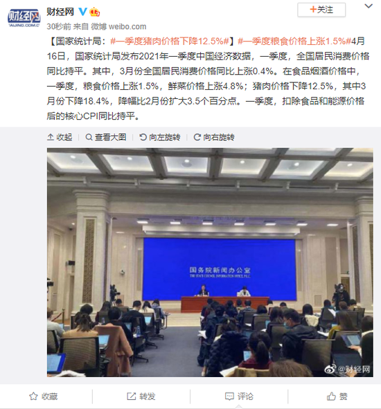 4月16日,国家统计局发布2021年一季度中国经济数据,一季度,全国居民消费价格同比持平。其中,3月份全国居民消费价格同比上涨0.4%。在食品烟酒价格中,一季度,粮食价格上涨1.5%,鲜菜价格上涨4.8%;猪肉价格下降12.5%,其中3月份下降18.4%,降幅比2月份扩大3.5个百分点。一季度,扣除食品和能源价格后的核心CPI同比持平。