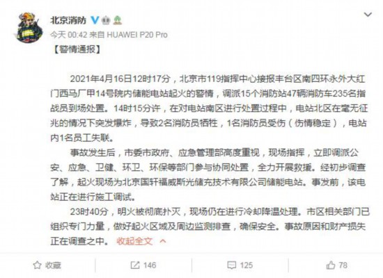 荔枝新闻讯 北京市消防总队官方微博17日凌晨发布警情通报称,2021年4月16日12时17分,北京市119指挥中心接报丰台区南四环永外大红门西马厂甲14号院内储能电站起火的警情,调派15个消防站47辆消防车235名指战员到场处置。14时15分许,在对电站南区进行处置过程中,电站北区在毫无征兆的情况下突发爆炸,导致2名消防员牺牲,1名消防员受伤(伤情稳定),电站内1名员工失联。