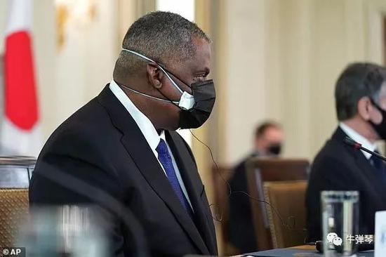 很有意思的是,陪同拜登会见的官僚,比如国防部长奥斯汀,一个黑人大个子,也是两只口罩,还勒得特别紧,你上次去日本,也没两只口罩啊。