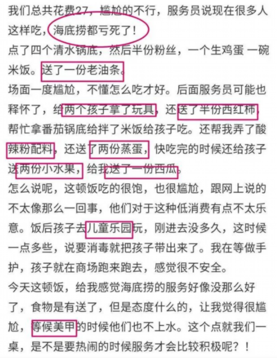 时澹:开门做生意,也不是每一单都赚,27元吃海底捞,说不定是给他们打了广告,生意更好了。毕竟也不是每个人都能忍住在火锅店不点肉的哈哈!