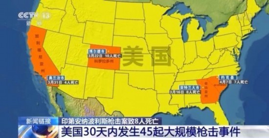 近期,美国大规模枪击案更是接连不断。3月16日至今,已经发生45起大规模枪击事件。从地图上看,这些枪击案几乎遍布美国各地。