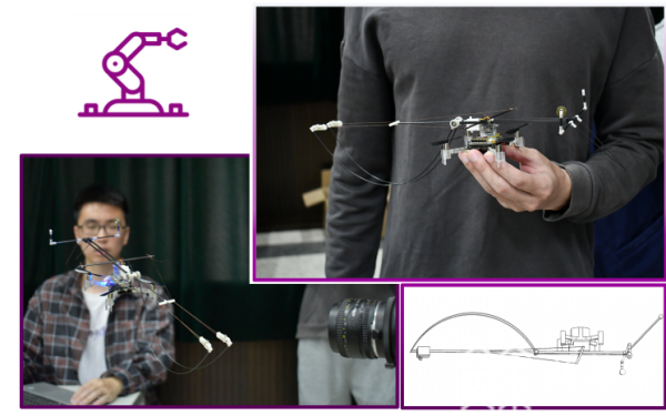 获得智能控制大学组一等奖的作品“爪刺式飞行爬壁机器人”,依靠微小爪刺的摩擦抓附实现机器人垂直壁面爬行功能,依靠四轴无人机实现机器人飞行功能。本项目通过理论分析和模拟计算,分别对机器人的各项结构进行设计,并完成对应的控制方法。团队负责人毛晨曦自行设计了爬壁系统、着陆系统和复飞系统,最终实现机器人的飞行,在粗糙壁面着陆和爬行,从粗糙壁面复飞的完整功能。