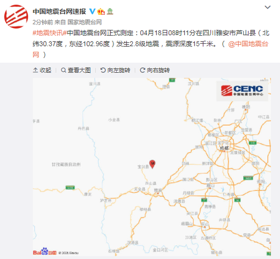 中国地震台网正式测定:04月18日08时11分在四川雅安市芦山县(北纬30.37度,东经102.96度)发生2.8级地震,震源深度15千米。