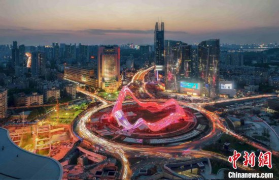 光谷广场综合体的地标性雕塑“星河” 。武汉东湖新技术开发区供图