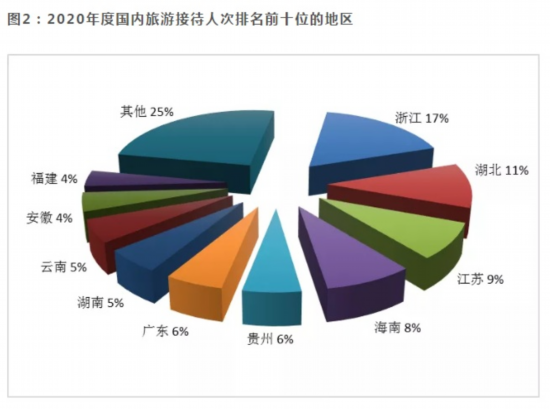 2020年度旅行社国内旅游接待人次排名前十位的地区由高到低依次为浙江、湖北、江苏、海南、贵州、广东、湖南、云南、安徽、福建。