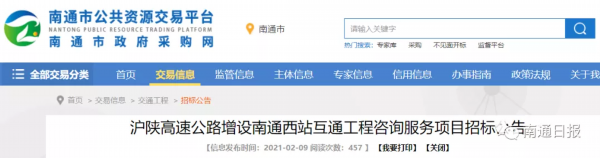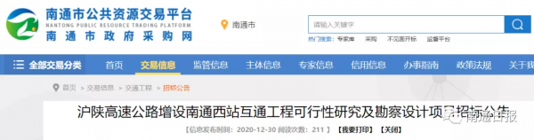去年12月30日和今年2月9日,南通市公共资源交易平台曾发布《沪陕高速公路增设南通西站互通工程可行性研究及勘察设计项目招标公告》《沪陕高速公路增设南通西站互通工程咨询服务项目招标公告》。