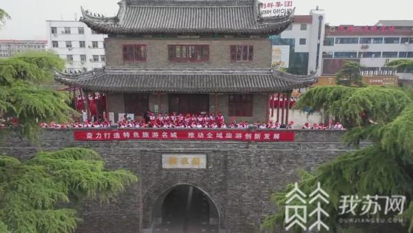 在镇淮楼上,一场融汇古今的“撞钟击鼓”活动也在激情展示中。身穿汉服的青年志愿者,在韵律节奏中撞击铜钟,敲打大鼓。洪亮的钟声响彻长空,咚咚的鼓音催人振奋,百余名淮安市楚州实小的同学们身穿校服,围站在城楼的四周,快乐地挥舞着小国旗,展示这座古迹古今交融的独特魅力。