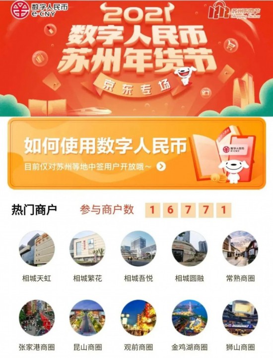 今年年初,苏州开启了“数字人民币·苏州年货节京东专场”活动,发放3000万数字人民币苏州年货节红包,进一步巩固和扩大数字人民币苏州试点工作成效。