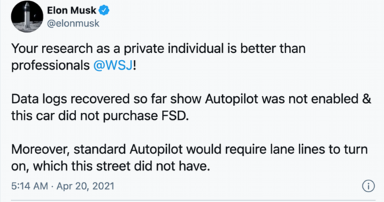 在一辆无人驾驶的特斯拉在美国得州撞树起火导致2人丧生之后,据美国消费者新闻和商业频道(CNBC)报道,特斯拉公司CEO马斯克20日在推特上称,事故车辆没有打开自动驾驶系统。