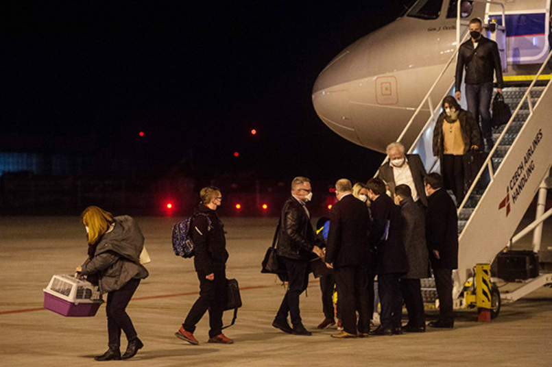 当地时间2021年4月19日,捷克布拉格,20名遭俄罗斯驱逐的捷克外交人员当天分批离开捷克驻俄使馆,已抵达当地机场。人民视觉 图