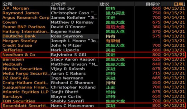 彭博显示,英伟达近期获小摩给予660美元目标价、Raymond James给予750美元目标价,当前最高目标价800美元目标价由Needham&Co和Rosenblatt在4月13日给予。