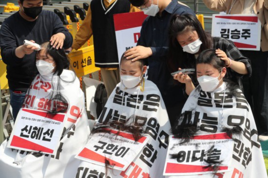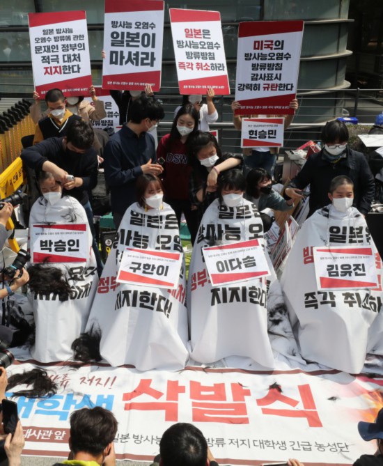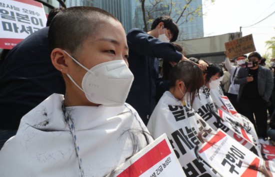 据韩国newspim网站报道,4月20日,在日本驻韩大使馆前,“韩国大学生进步联合”的成员集体削发,抗议日本政府排污入海的决定。现场引发众多民众和媒体记者的围观。