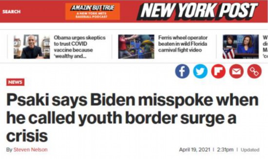 外媒报道拜登政府首次承认美国边境移民激增是场“危机”后,美国白宫出来解释了。据《纽约邮报》消息,美国白宫新闻秘书普萨基19日表示,拜登当时口误了,“总统并不认为儿童来到我们的边境寻求庇护,以躲避暴力、经济困难和其他可怕情况是一场危机”。
