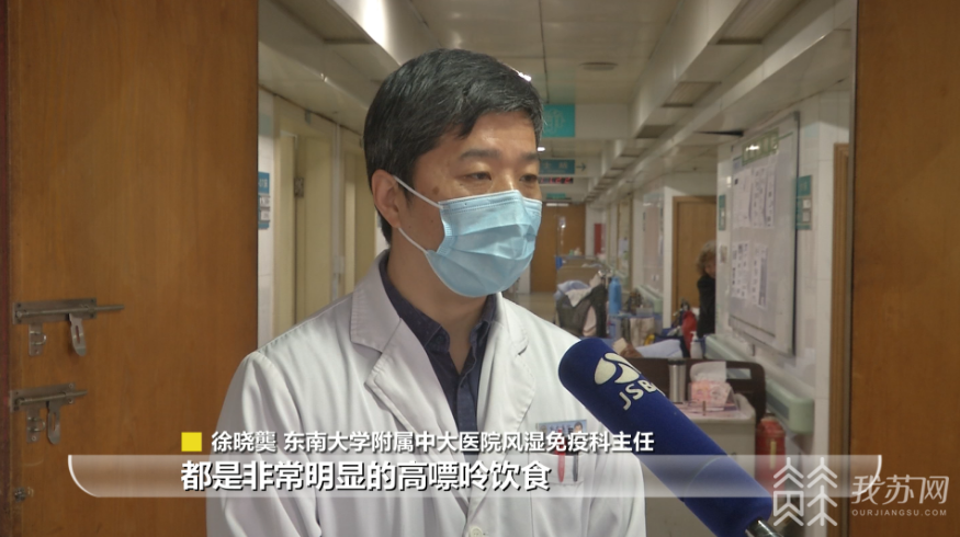 徐晓龑是东南大学附属中大医院风湿免疫科主任,他告诉记者,现在很多的年轻人,甚至十多岁高中生或大学刚入学的学生已经出现典型的痛风发作症状,“甚至二十多岁三十多岁已经到了慢性痛风期的病人逐年增多,主要跟现在的饮食习惯有很大的影响,第一高嘌呤饮食,快餐文化的影响,第二个大量的饮料摄入,尤其含果糖饮料的摄入,会导致高尿酸的比例明显升高。”