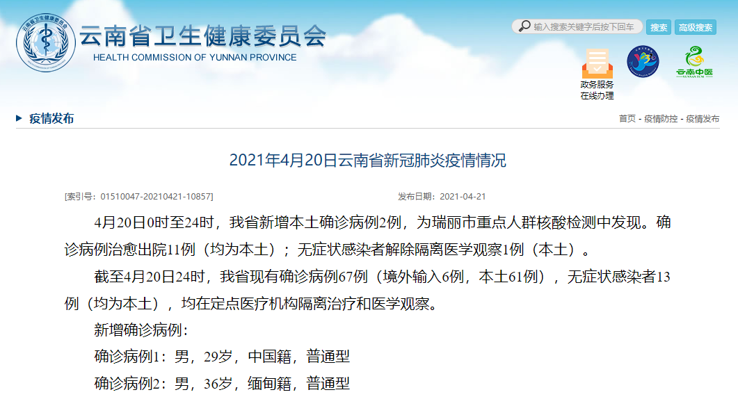 截至4月20日24时,云南省现有确诊病例67例(境外输入6例,本土61例),无症状感染者13例(均为本土),均在定点医疗机构隔离治疗和医学观察。