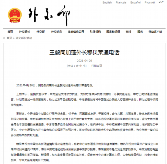 2021年4月20日,国务委员兼外长王毅同加蓬外长穆贝莱通电话。