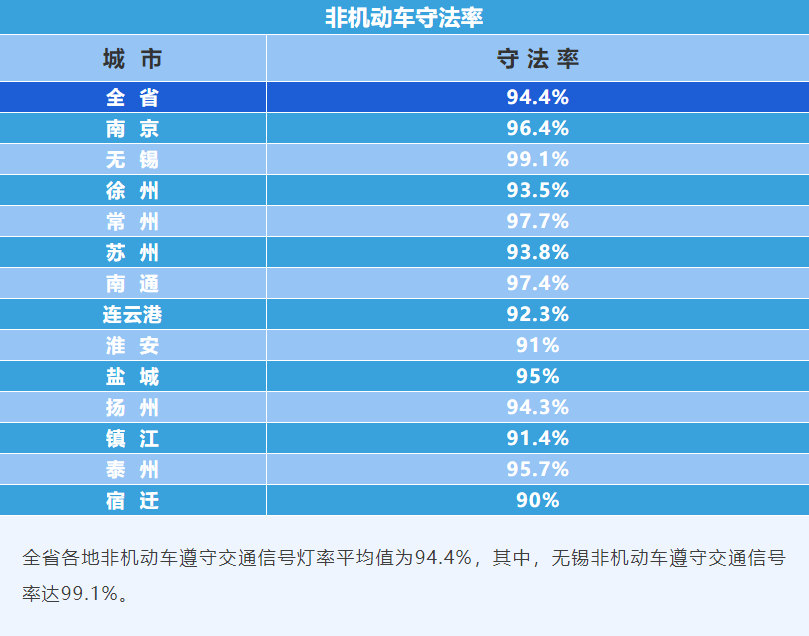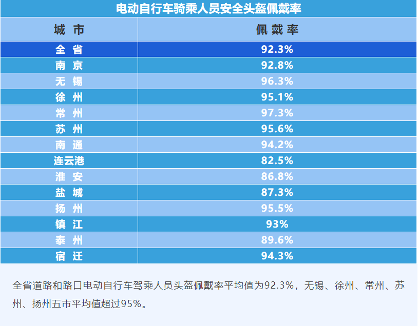 为切实加强城市道路交通秩序整治,推进城市交通乱点治理,推动“一盔一带”安全守护行动,今年一季度,省公安厅交警总队对全省13个设区市示范道路和示范路口的交通秩序进行了暗访检查,重点对机动车依法礼让率(无信号灯斑马线前机动车礼让行人),非机动车守法率、行人守法率,电动自行车挂牌率,电动自行车骑乘人员安全头盔佩戴率,汽车驾乘人员安全带使用率等主要指标进行测评。