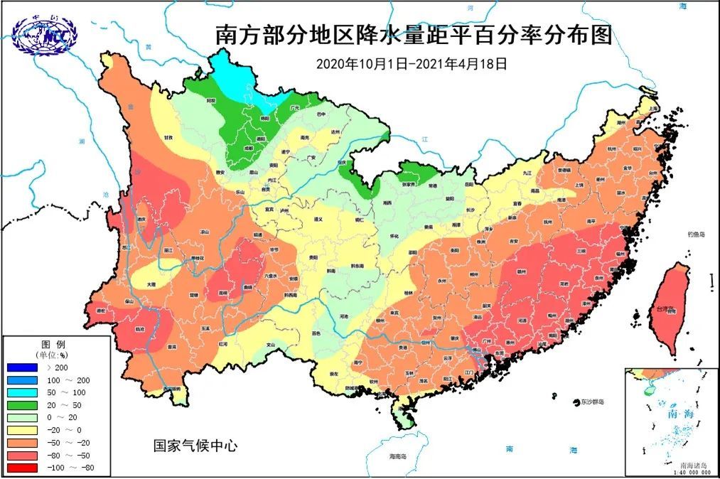 2020年10月1日至2021年4月18日我国南方部分地区降水量距平百分率分布图