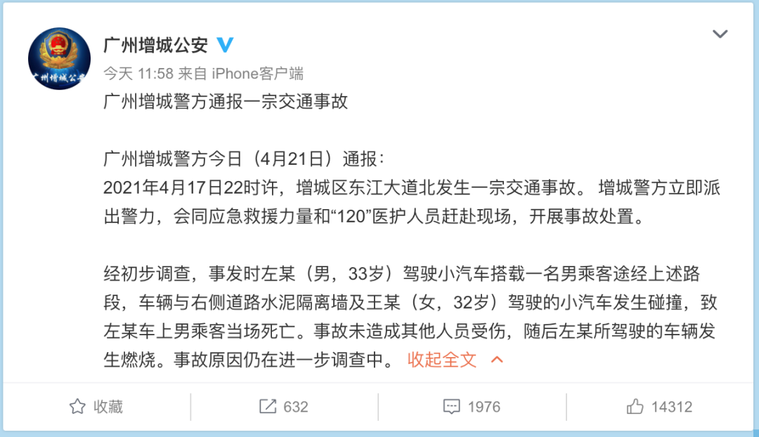 21日中午,广州市公安局增城区分局通报了相关情况,该事故造成1人死亡: