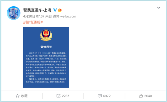 4月20日早间,上海市公安局通报了事件处理情况:4月19日11时24分许,青浦公安分局接报,有人在上海车展一展台内闹事。民警立即赶赴现场处置。