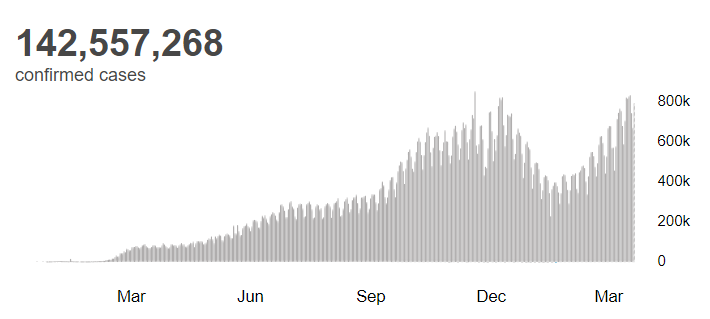 根据世卫组织最新实时统计数据,截至欧洲中部夏令时间4月21日19时19分(北京时间4月22日1时19分),全球累计新冠肺炎确诊病例142557268例,累计死亡病例3037398例。21日全球新增新冠肺炎确诊病例793011例,新增死亡病例11458例。