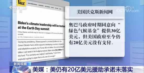 美国在气候领域的“欠账”还不止于此。美国沃克斯新闻网19日发文称,奥巴马政府时期同意向“绿色气候基金”提供30亿美元,但实际执行的拨款仅有10亿美元。此后,特朗普政府更直接表态拒绝提供后续资金支持。美国政府至今仍有20亿美元没有落实。“绿色气候基金”是《联合国气候变化框架公约》第十六次缔约方大会决定设立的机构,旨在帮助发展中国家适应气候变化。
