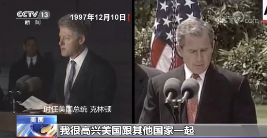 时任美国总统 克林顿(1997年12月10日): 我很高兴美国跟其他国家一起,达成这项极具历史意义的协议, 为解决气候变化问题采取前所未有的行动。