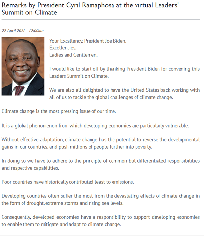 拉马福萨称发展中国家碳排放量非常小,应和发达国家有所区别,且历史上对排放负最大责任的发达经济体应履行其对发展中经济体的责任。发展中国家经常遭受干旱、极端风暴和海平面上升等形式的气候变化的破坏性影响,发达经济体有责任支持发展中经济体,使其能够减轻和适应气候变化。同时只有所有国家都履行共同承诺,才能取得进展。