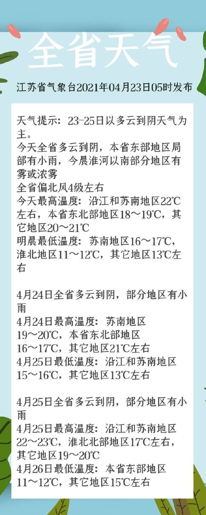 【多云到阴 局部小雨】今天全省多云到阴,本省东部地区局部有小雨,今晨淮河以南部分地区有雾或浓雾,全省偏北风4级左右,今天最高温度:沿江和苏南地区22℃左右,本省东北部地区18~19℃,其它地区20~21℃,明晨最低温度:苏南地区16~17℃,淮北地区11~12℃,其它地区13℃左右。