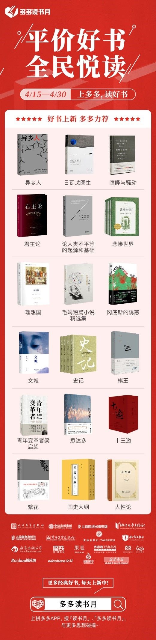 据悉,拼多多于3月31日启动“多多读书月”大型知识普惠行动,全力营造“平价好书 全民悦读”的良好氛围。并在4月15日至4月30日期间,设立5000万读书基金,对中外经典名著、畅销图书等进行专项补贴。十余位资深编辑从诺贝尔文学奖、雨果奖、茅盾文学奖及全网热销榜单基础上筛选出上千余本优质书单,在全网最低价基础上补贴正版经典名著。