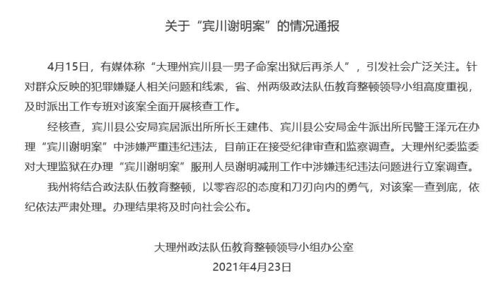 “大理政法”微信公众号消息,云南省大理州政法队伍教育整顿领导小组办公室23日晚发布关于“宾川谢明案”的情况通报,大理州宾川县公安局宾居派出所所长王建伟、宾川县公安局金牛派出所民警王泽元在办理“宾川谢明案”中涉嫌严重违纪违法,目前正在接受纪律审查和监察调查。大理州纪委监委对大理监狱在办理“宾川谢明案”服刑人员谢明减刑工作中涉嫌违纪违法问题进行立案调查。详情>>