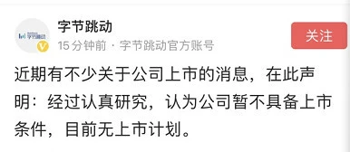 字节跳动官方账号消息,近期有不少关于公司上市的消息,在此声明:经过认真研究,认为公司暂不具备上市条件,目前无上市计划。详情>>