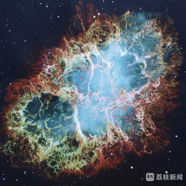 记者在现场看到,陈英华共带来了五幅刺绣作品,其中就有最为著名的《蟹状星云》《马头星云》《鹰状星云》《猎户座大星云》以及新作《石刻天文图》。其中,《石刻天文图》是陈英华历时两年多的全新创作,此次展出,也是《石刻天文图》第一次在公众面前亮相。