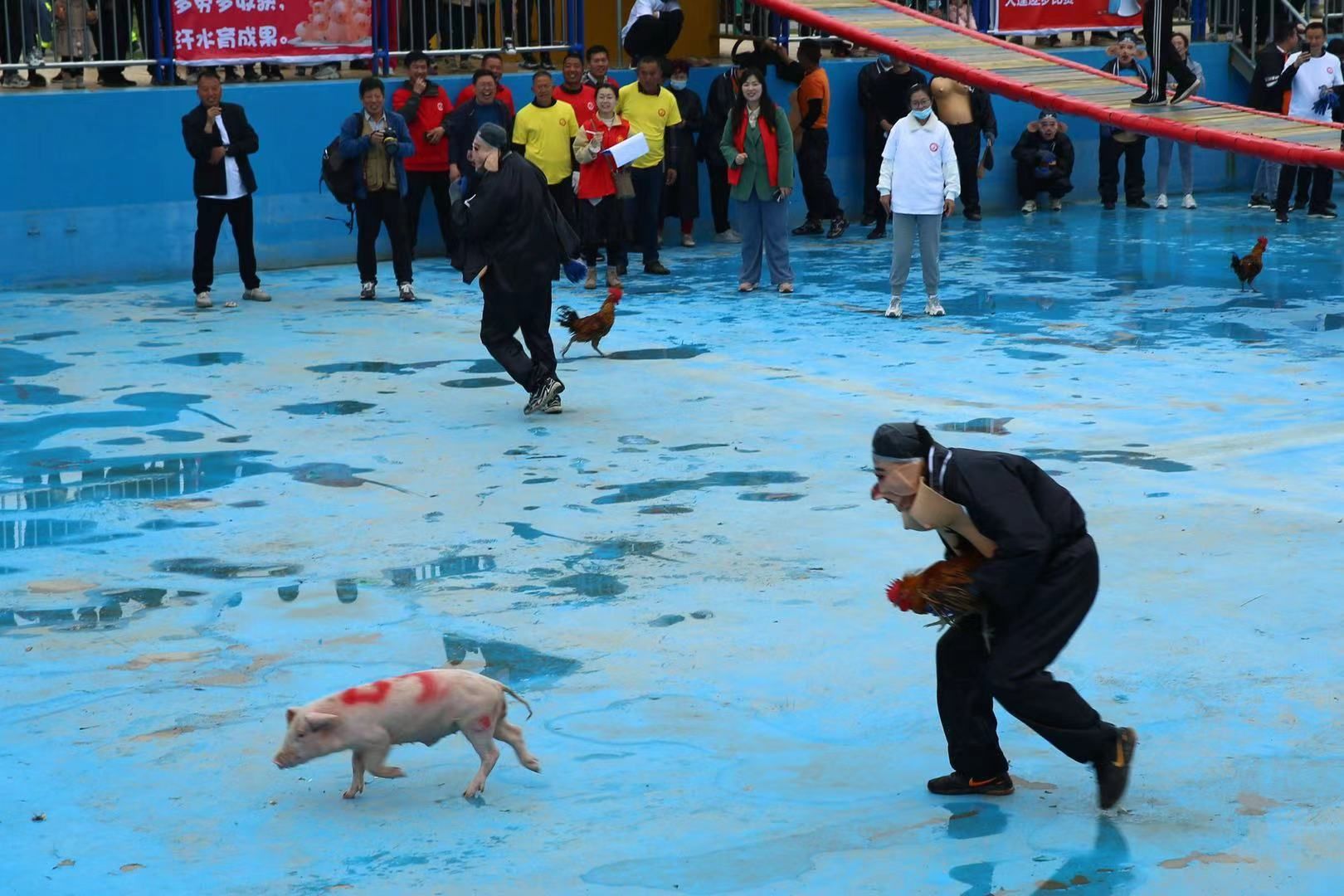 农民运动会有趣有味。此次运动会除了常规的篮球、羽毛球、乒乓球的比赛外,接地气贴近百姓生活,观众最多,笑声最高的则是趣味项目的比赛,天蓬逐梦是穿着猪八戒服装道具的运动员抓鸡逮猪比赛,四处乱飞的公鸡和到处乱蹿的猪,增加了活动的难度,也给现场观众增加了无比的欢乐。有的运动员捉鸡逮猪如探囊取物,有的则是次次扑空,让人忍俊不禁。