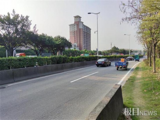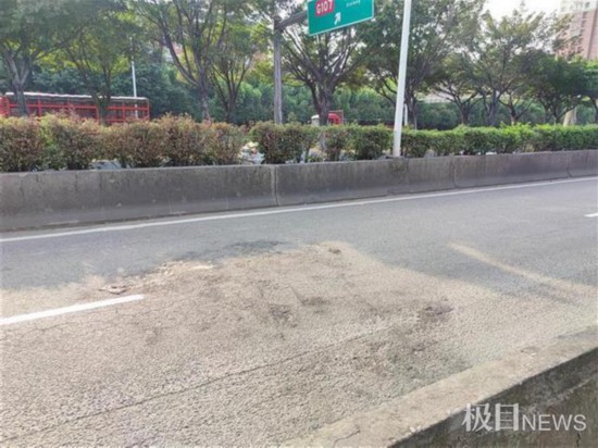 4月24日下午,距事发时间一周后,极目新闻记者回访增城东江大道事发现场。记者看到,事发路段为单向直行双车道,车道中间为虚线。在事发地路边的水泥隔离墙约一米高,隔离墙外侧的一角已经出现部分碎裂,墙体上的刮痕超过三米。在碰撞地点前不到十米处,一大块路面还有燃烧留下的痕迹。