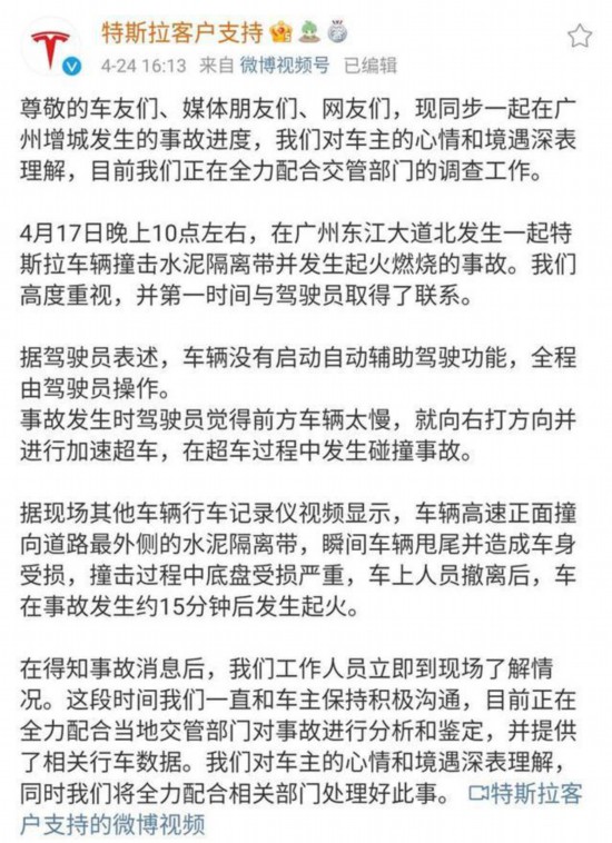 24日下午4时许,特斯拉官方发文通报称,4月17日事故发生后,特斯拉高度重视,并第一时间与驾驶员取得了联系。据驾驶员表述,车辆没有启动自动辅助驾驶功能,全程由驾驶员操作。事故发生时驾驶员觉得前方车辆太慢,就向右打方向并进行加速超车,在超车过程中发生碰撞事故。