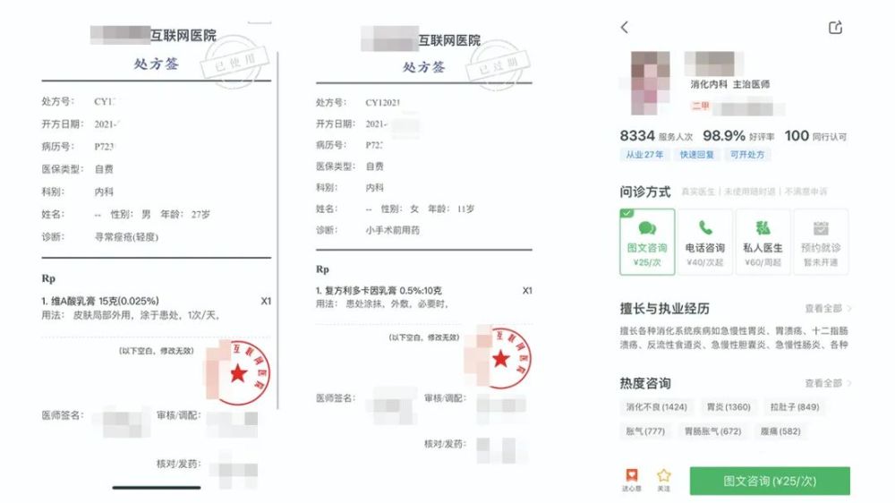 线上接诊医生询问“为什么要用这个药物”,半月谈记者回答“皮肤局部麻醉”,5分钟内即获得了银川某互联网医院的处方签。值得注意的是,这份处方签与半月谈记者此前购买维A酸乳膏时获得的处方签,医师、审核调配、核对发药3人的签名完全一致。