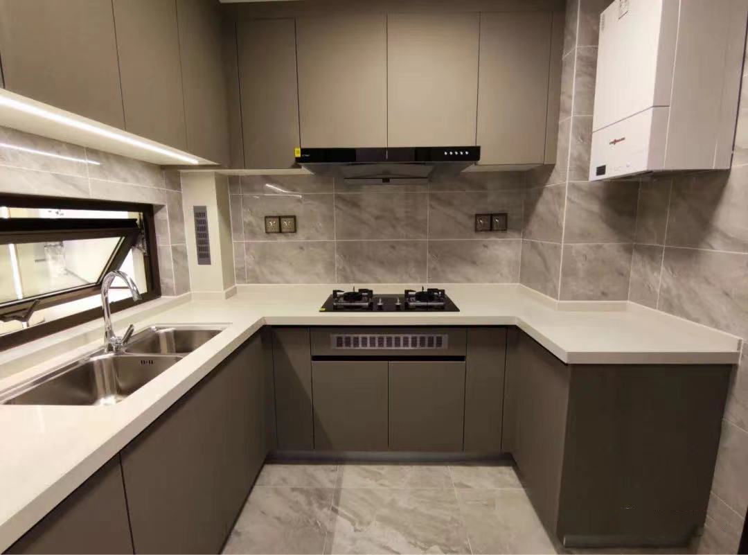 厨房为最符合人体工学的U型设计,最大化的提高储物和使用空间。采用横向窗户,相比常规竖向开窗,能多一排吊柜空间。此外,外悬约45度开窗设计,在保证空气流通的同时,避免雨水进入厨房,开窗时还不占用室内空间。
